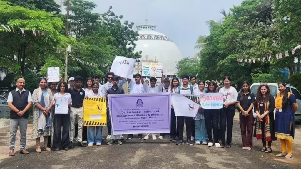 The Dr. Ambedkar Institute of Management Studies and Research (DAIMSR) organised a Cyber Crime Awareness Road March on Monday with the mission of spreading awareness about the growing menace of cyber threats, online frauds, and the importance of digital vigilance among the public. The march, held in collaboration with local law enforcement agencies and cybersecurity professionals, witnessed enthusiastic participation from students, faculty members, and members of the community.
